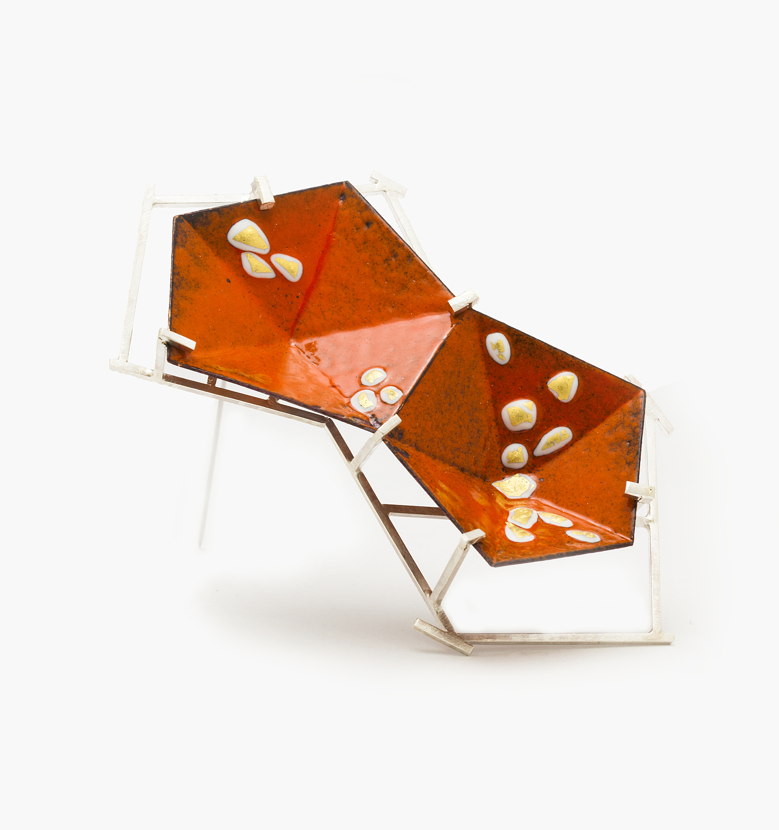 Hsiang-Ting's work has had two directions; her thesis project, examining contemporary gender issues, and her In Bloom brooches, two evolving series of enamel work on wire forms. In Bloom springs from Yen's background in Chinese watercolor painting. The first series utilizes layers of graceful wire outlines to create the contours of flowers and leaves; opaque enamel fills in parts of the form, vividly bringing them to life. The layered outlines give the pieces dimensionality, raising the design towards the viewer. Thus with bare and subtle attention, Yen uses a minimum of material to yield maximum representation.